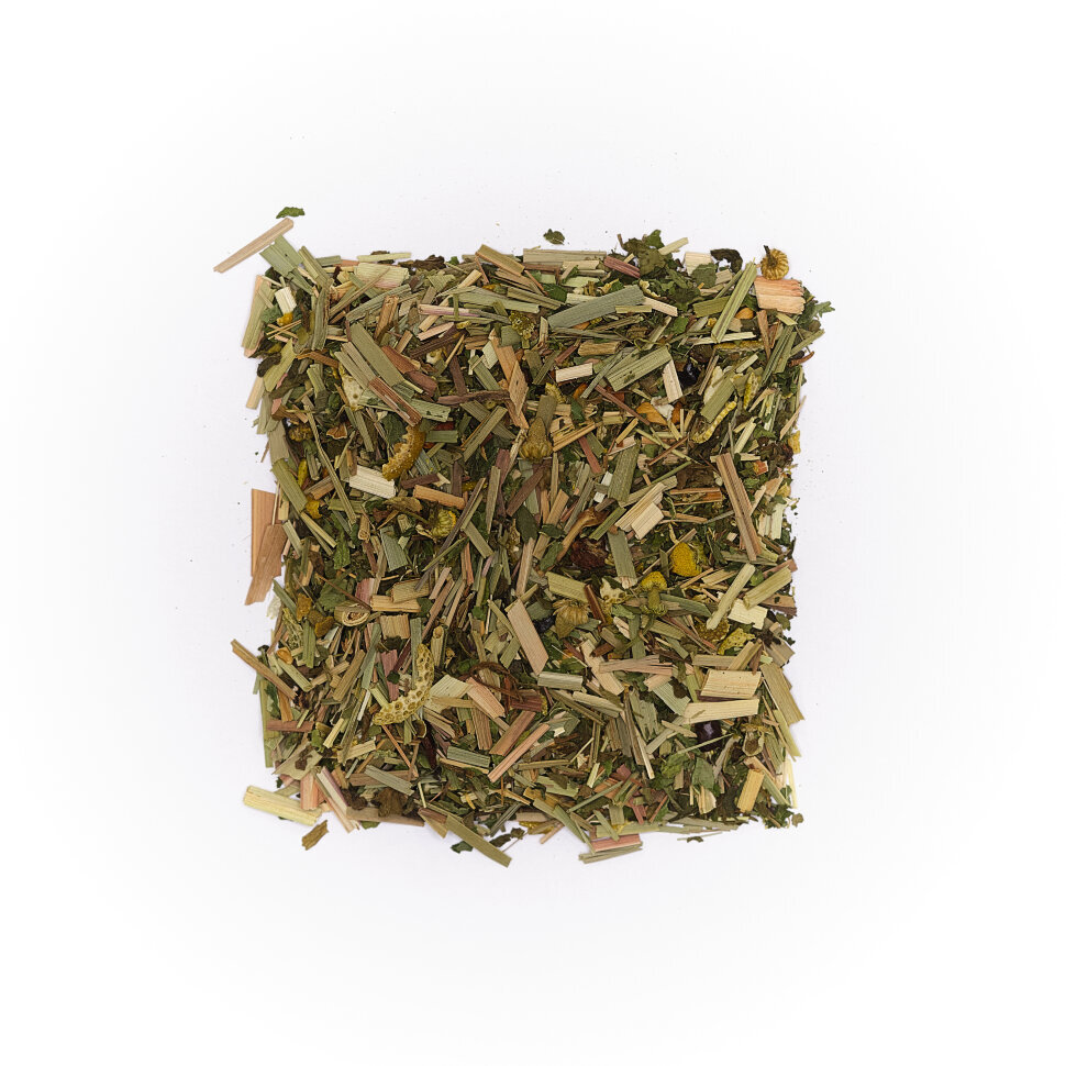 травяной смеси из лемонграсса, мяты, шиповника (кусочки плодов), апельсиновой цедры, цветков ромашки и апельсинового масла в качестве ароматизатора