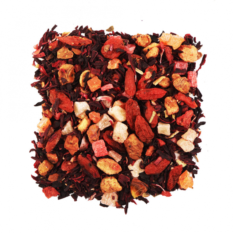 Настой малинового цвета. Аромат настоя сильный, с преобладанием нот тропических фруктов. Вкус с необычной, деликатной сладкой ягодной кислинкой. Послевкусие наполнено сладкими фруктовыми оттенками.