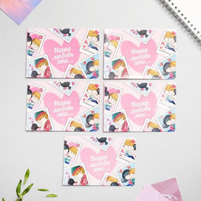 В набор конвертов «Наша любовь – это…» входит 5 конвертов. Размер конвертов (ширина х высота): 13 х 9 см.