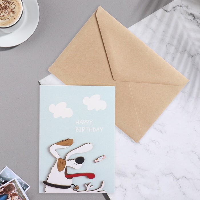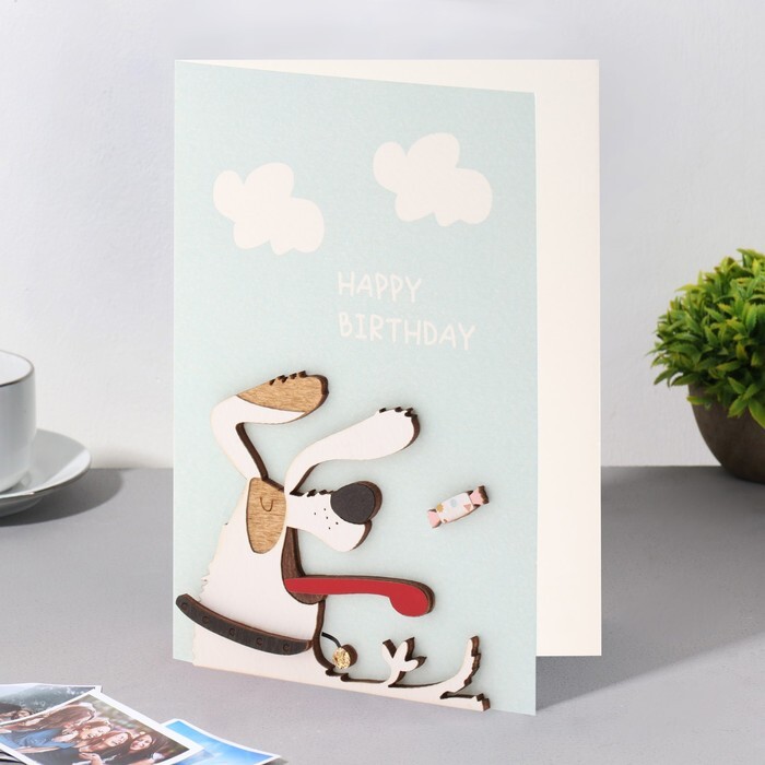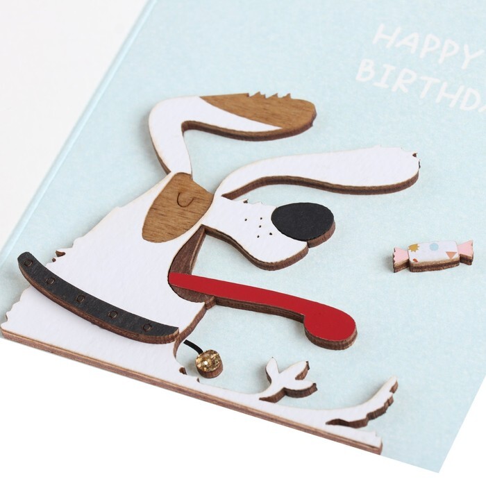 Открытка с деревянным элементом "Happy Birthday!" ручная работа, голубой фон, 14,7х10,5 см
