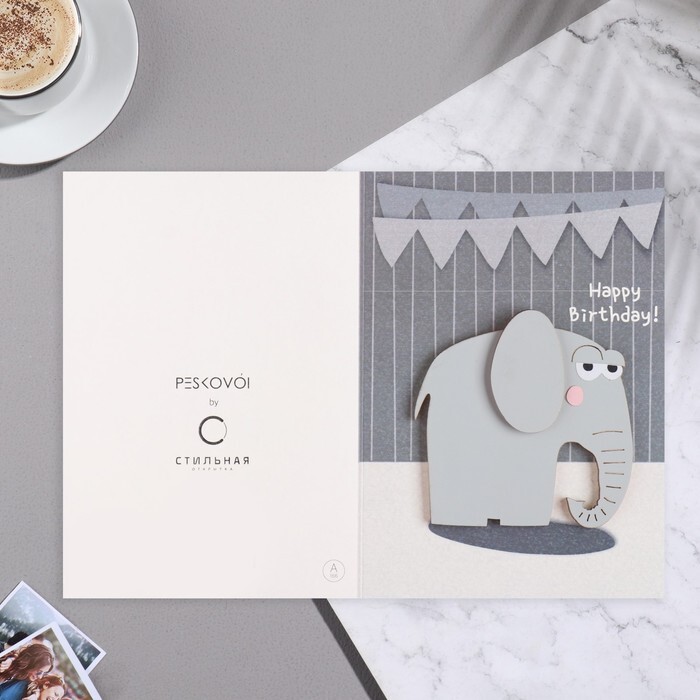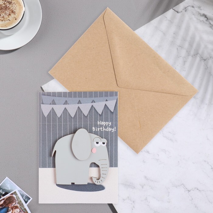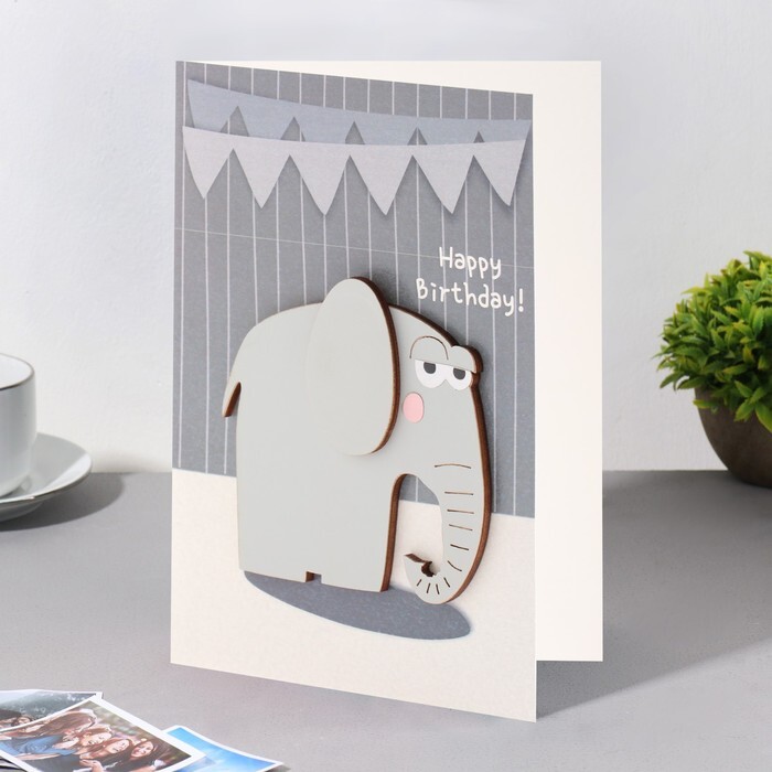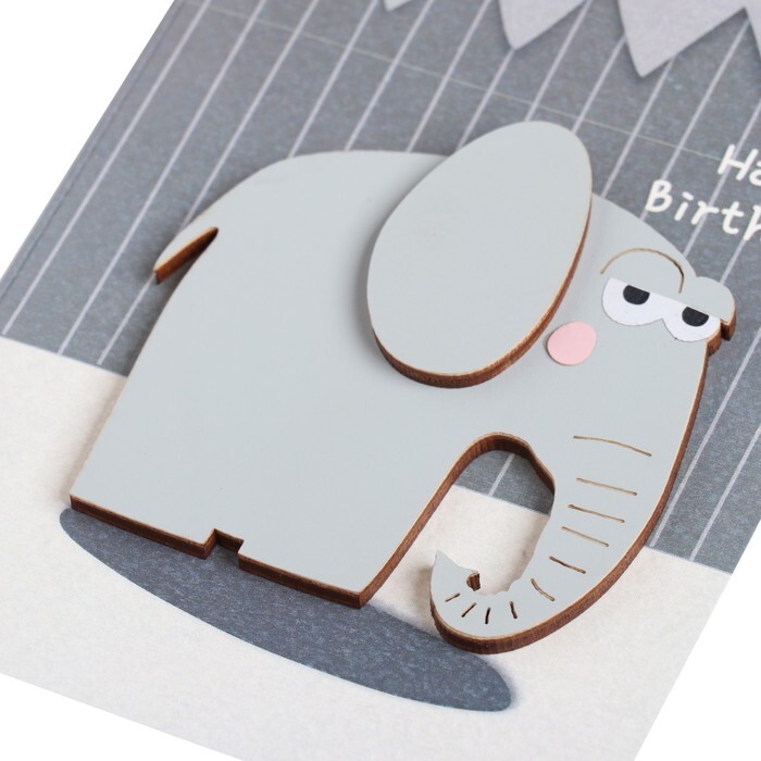 Открытка с деревянным элементом "Happy Birthday!" ручная работа, слон, 14,7х10,5 см