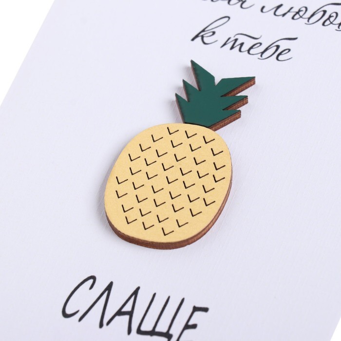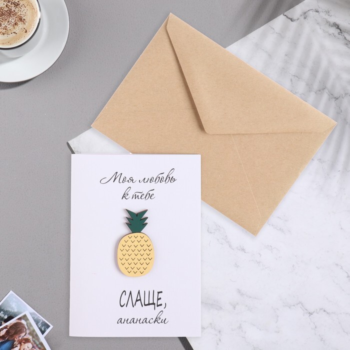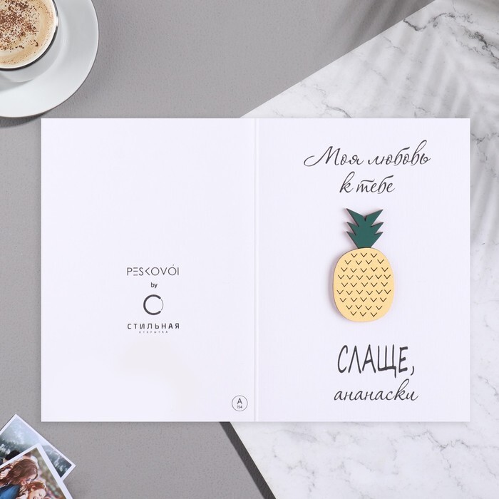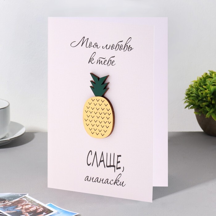 Открытка с деревянным элементом "Моя любовь к тебе слаще, ананаски" ручная работа, 14,7х10,5