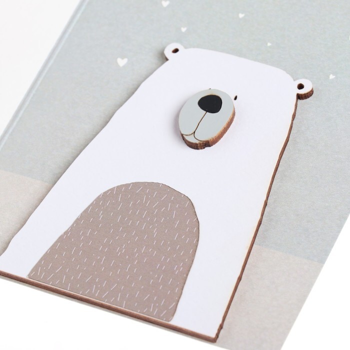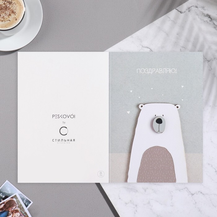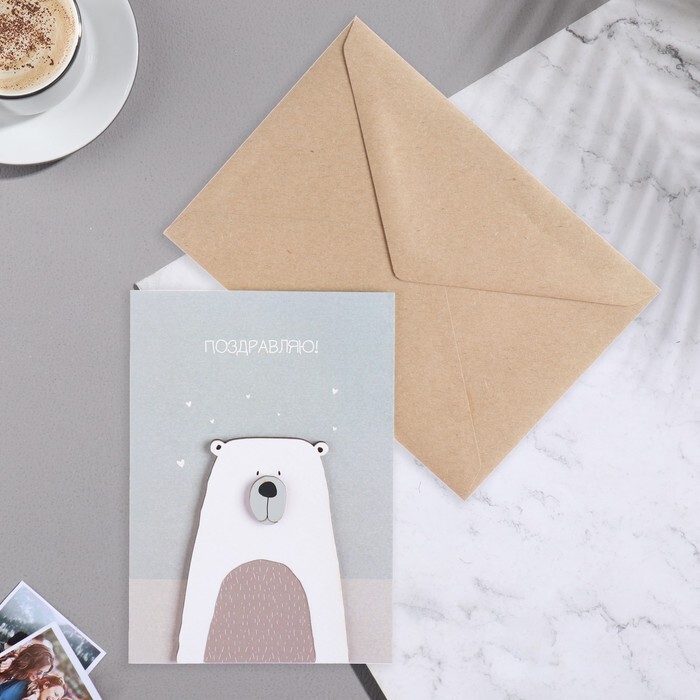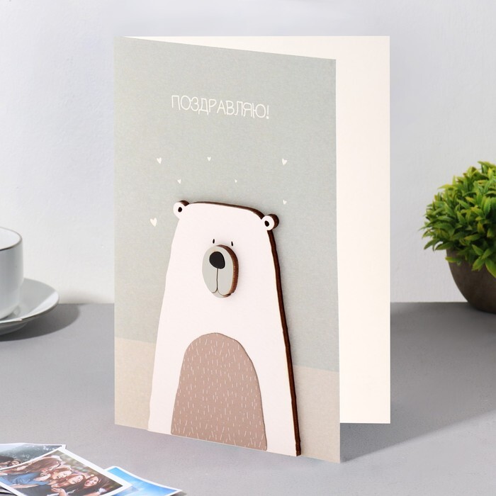 Открытка с деревянным элементом "Поздравляю!" ручная работа, белый тон, серый фон, 14,7х10,5