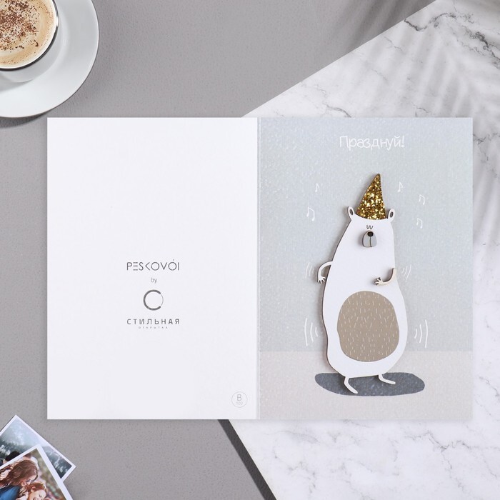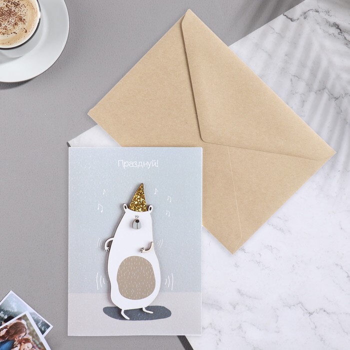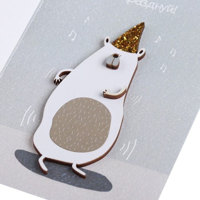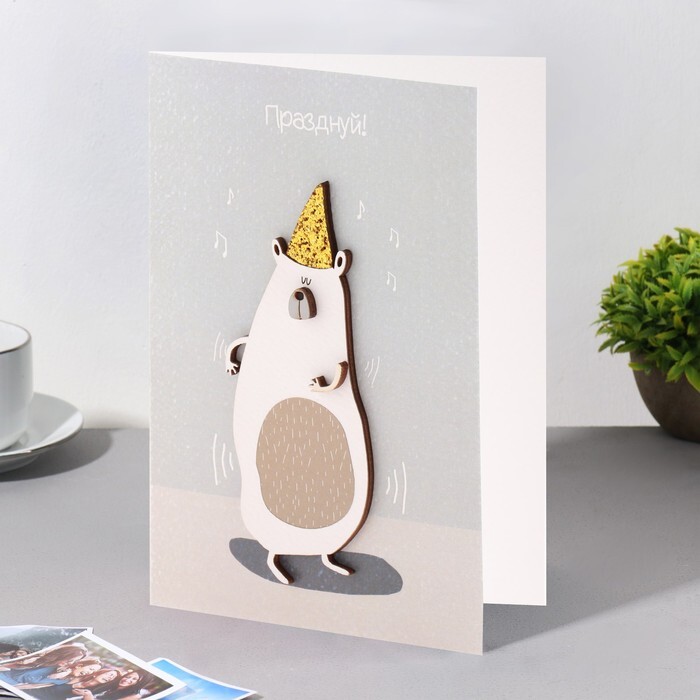 Открытка с деревянным элементом "Празднуй!" ручная работа, колпак, 14,7х10,5 см
