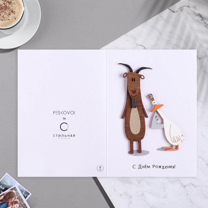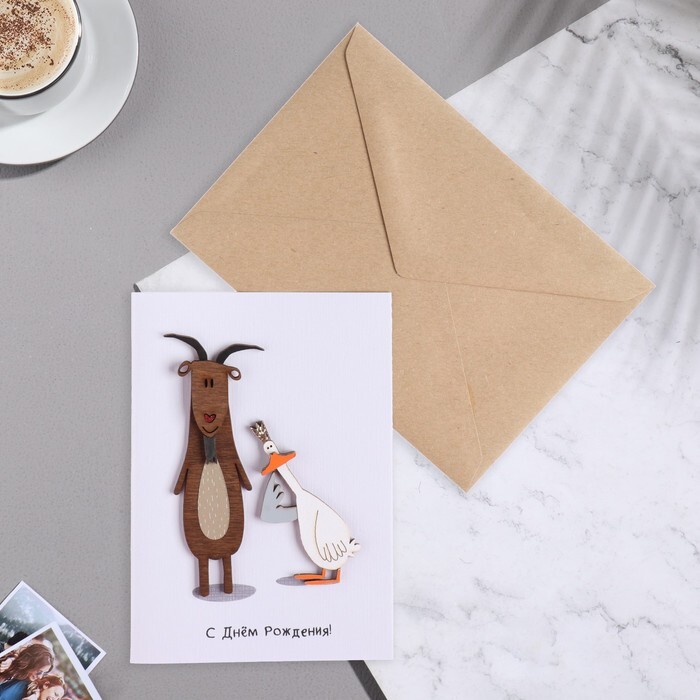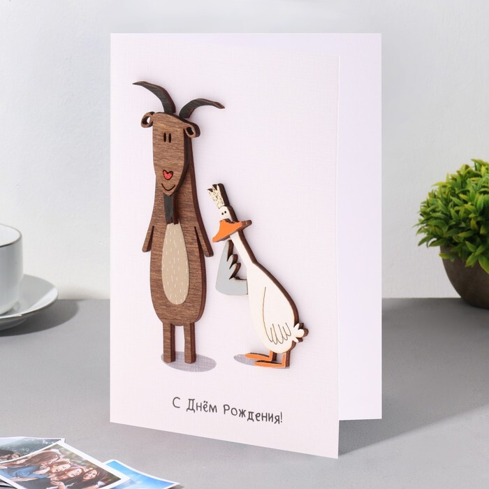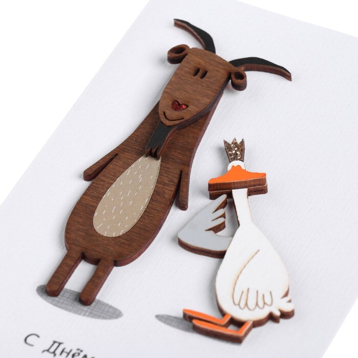 Открытка с деревянным элементом "С Днем Рождения!" ручная работа, коза, аист, 14,7х10,5 см