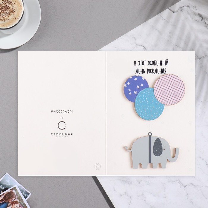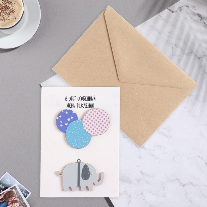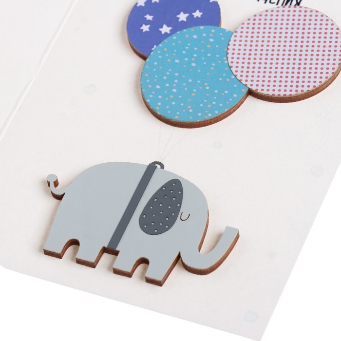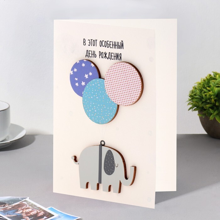 Открытка с деревянным элементом "В этот особенный День Рождения!" ручная работа, шары, слон,