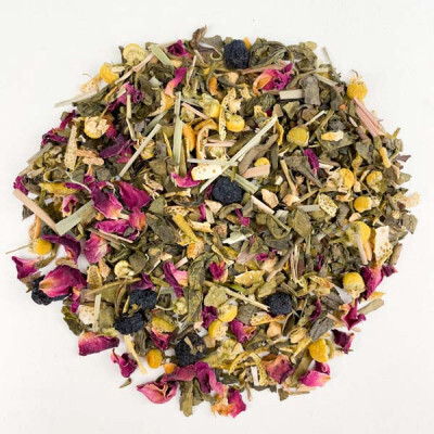 зеленый чай, ромашка, лемонграсс, лепестки розы, черноплодная рябина, корка апельсина, корень имбиря, с ароматом "Саусеп"